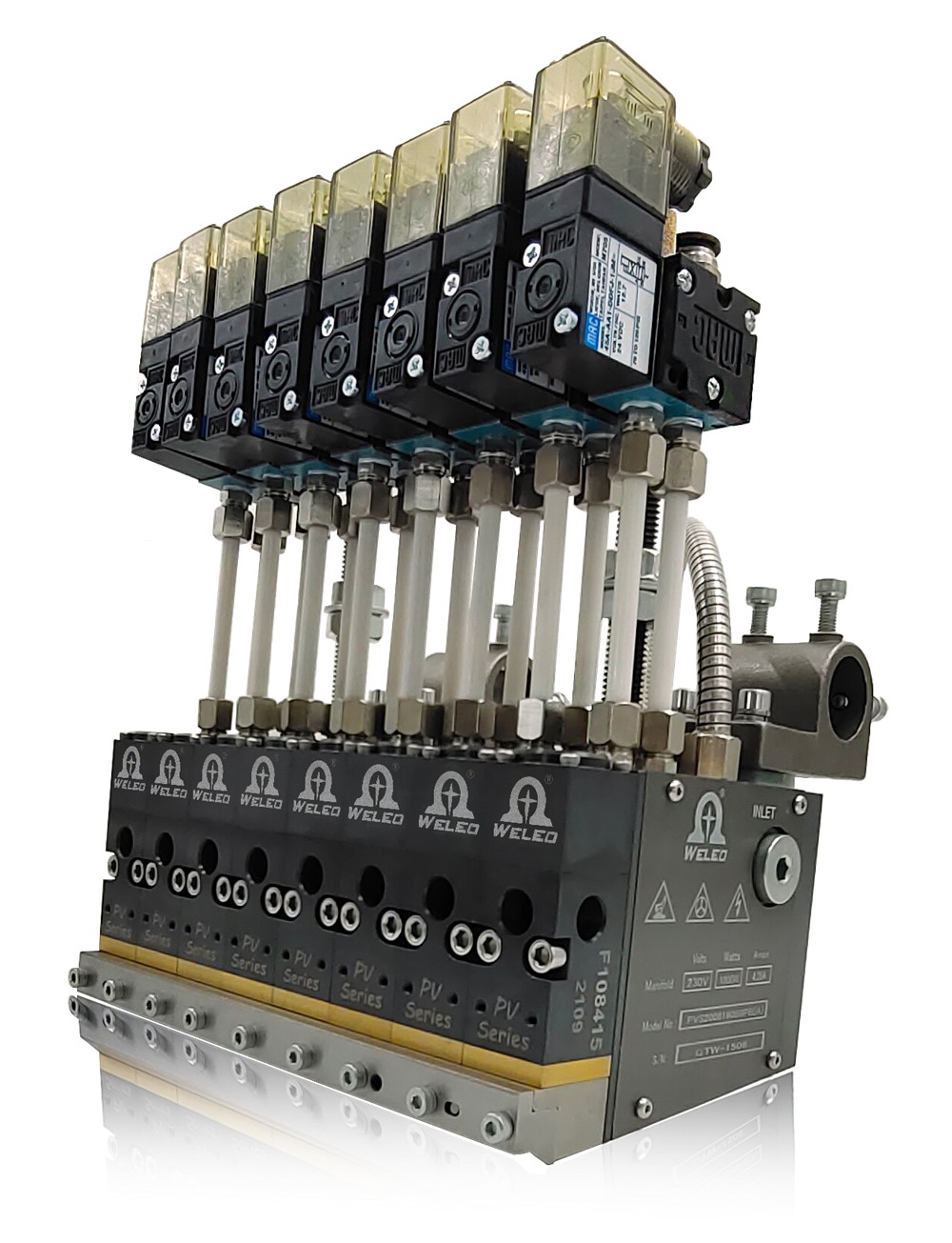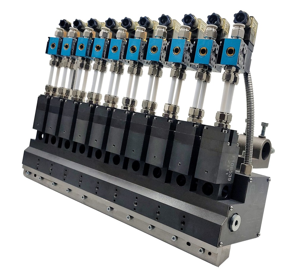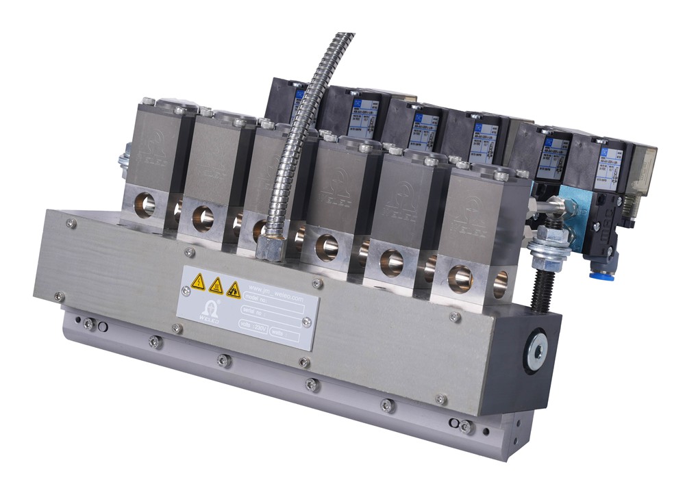 ES高速間斷涂布刮槍,噴槍帶有獨立的過(guò)濾閥體可多方向安裝進(jìn)彤膠, 涂膠槍使用氣關(guān)/氣開(kāi)反抽式模塊,當沒(méi)有氣壓供應到模塊時(shí),噴頭內的彈簧用于保持針頭關(guān)閉,ES模塊可以多組配置提供。每個(gè)ES高速模塊均安裝在噴槍的上部, 唇涂安裝于噴槍的低部直接控制間斷刮膠. 涂布槍加熱主體安裝多組加熱管受熱平均, 溫度控制兼容Pt100/Ni120惑溫器.
